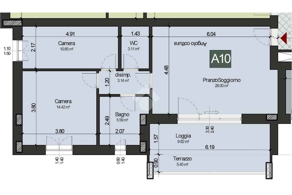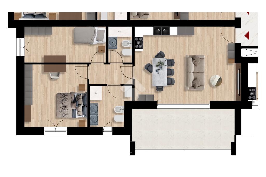 L’ingresso si apre su un ampio soggiorno con angolo cottura, perfetto per vivere ogni momento della giornata in un ambiente pratico e conviviale. Da qui si accede al terrazzo abitabile, ideale per cenare all’aperto o rilassarsi nel tempo libero. La zona notte comprende due camere da letto e doppi servizi, una comodità rara per appartamenti di questa tipologia.