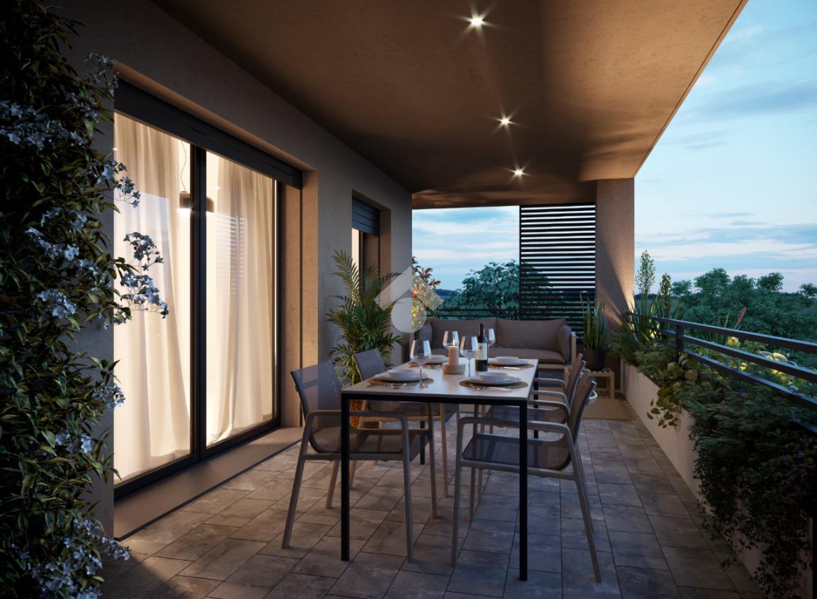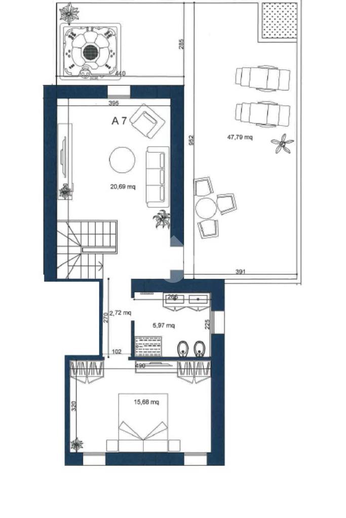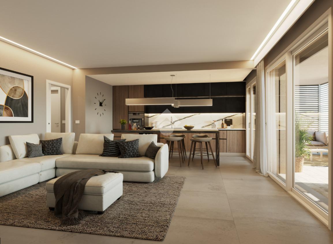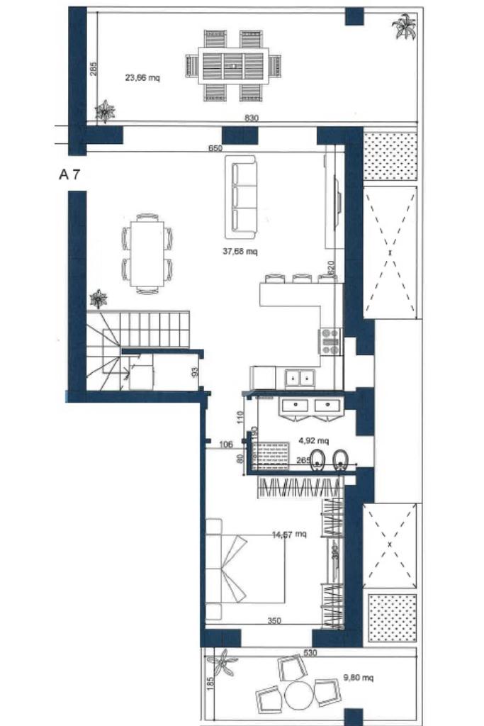 L'attico è composto da quattro locali, con la possibilità di avere una cucina separata. Uno dei punti di forza è il solarium di 47 mq, perfetto per momenti di relax all'aperto, e un terrazzino di 24 mq che aggiunge ulteriore spazio esterno.