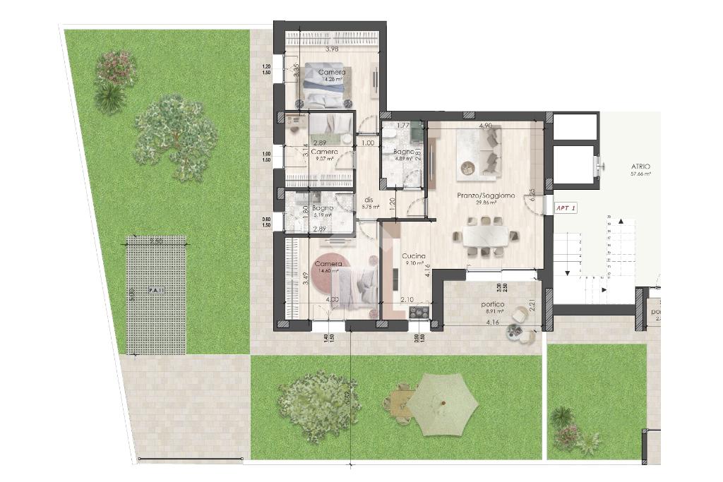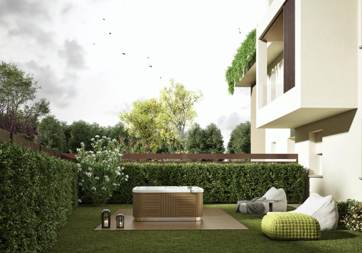 Ampia area cortiliva esclusiva con carrabile privato e giardino dove poter godere del massimo relax all'aria aperta