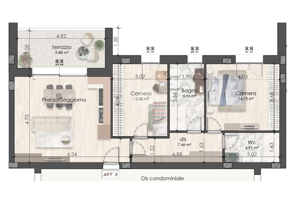L’appartamento, inserito in un contesto architettonico raffinato caratterizzato dai frangisole verticali, si compone di: