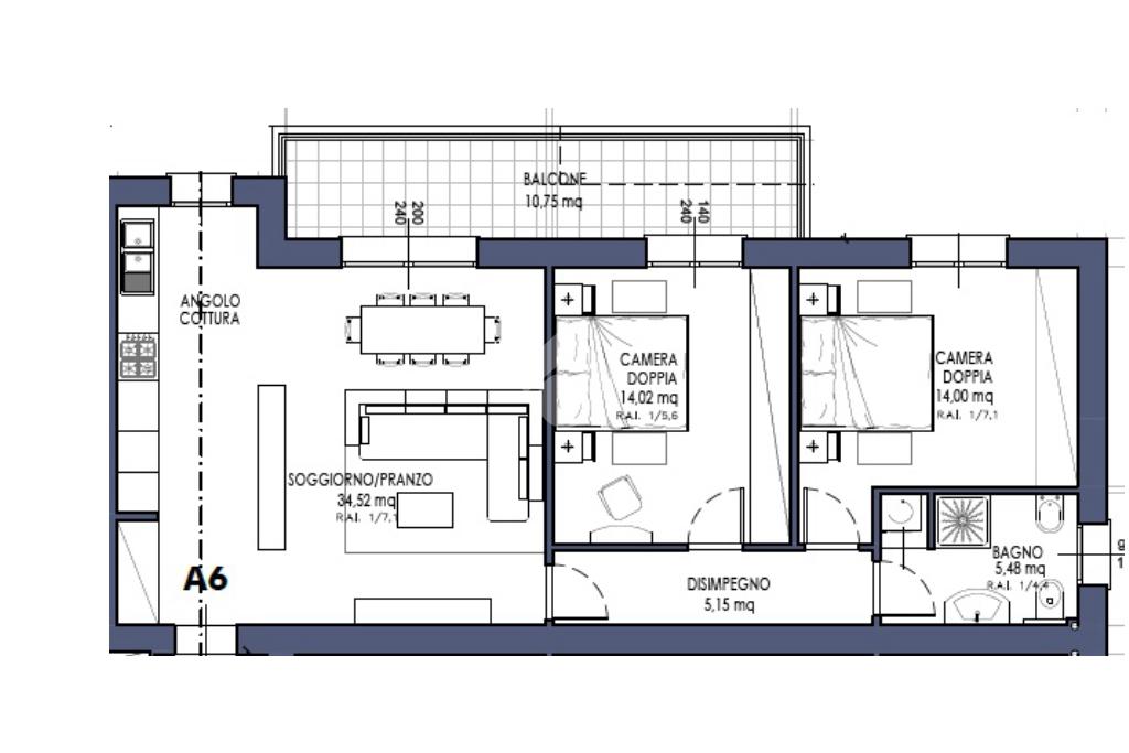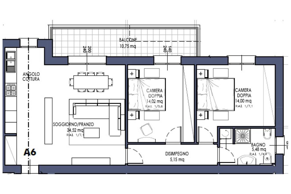 Il living di oltre 34 mq, ampio e luminoso, si apre su un terrazzino di 10 mq, perfetto per momenti di relax all'aperto. L'esposizione sud-est garantisce un'ottima illuminazione naturale durante tutto il giorno. Le due camere matrimoniali offrono spazio e sono ideali per famiglie o coppie.