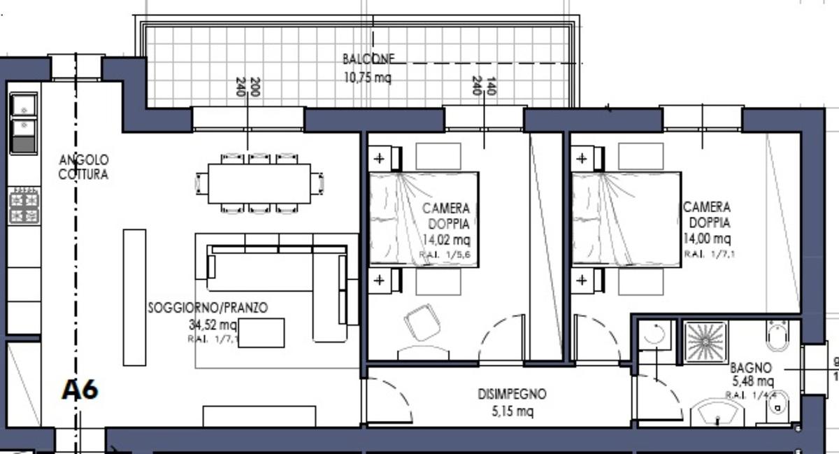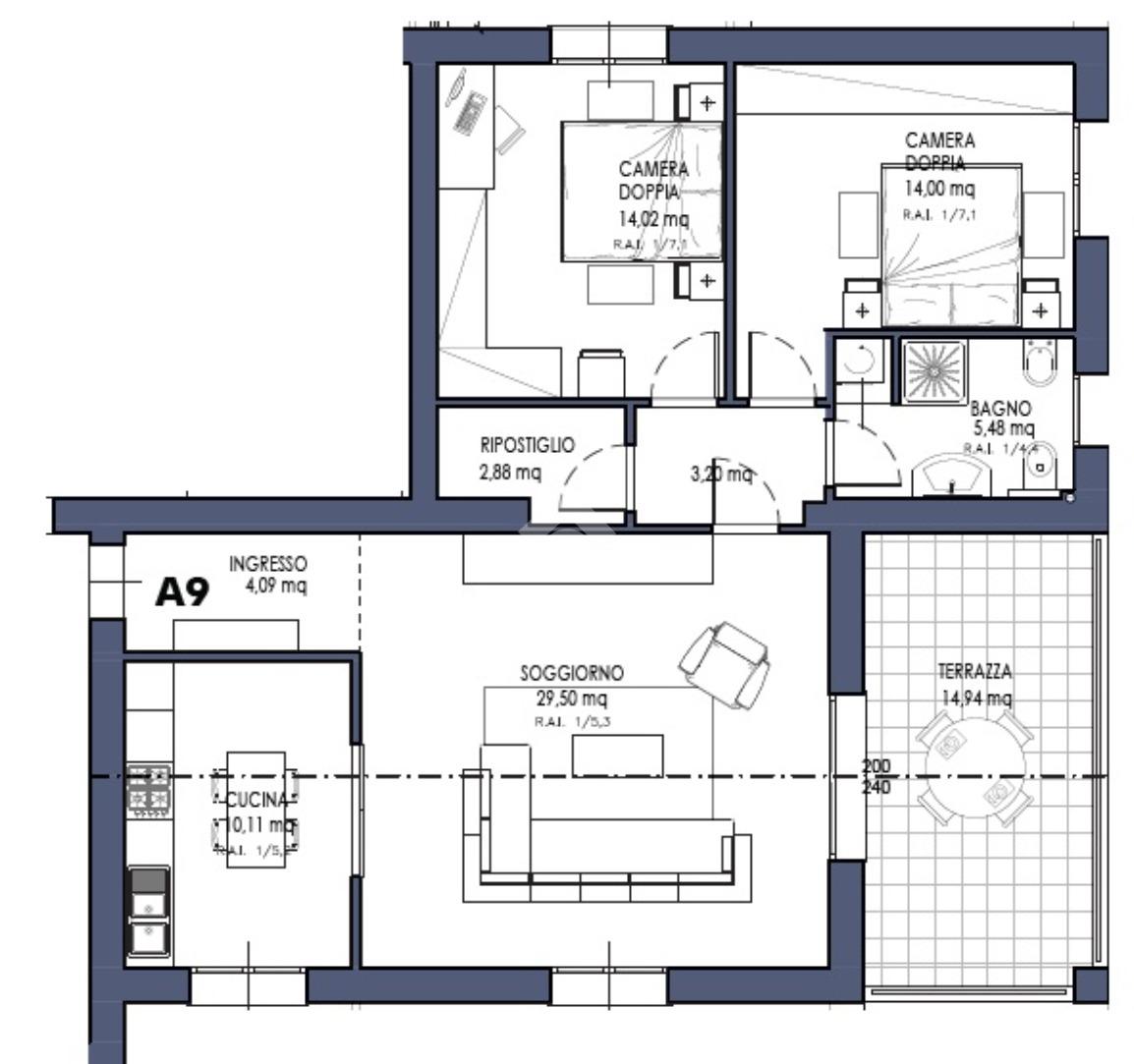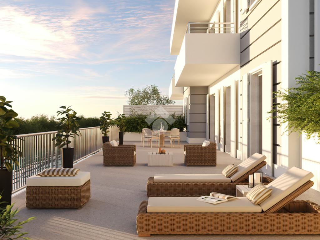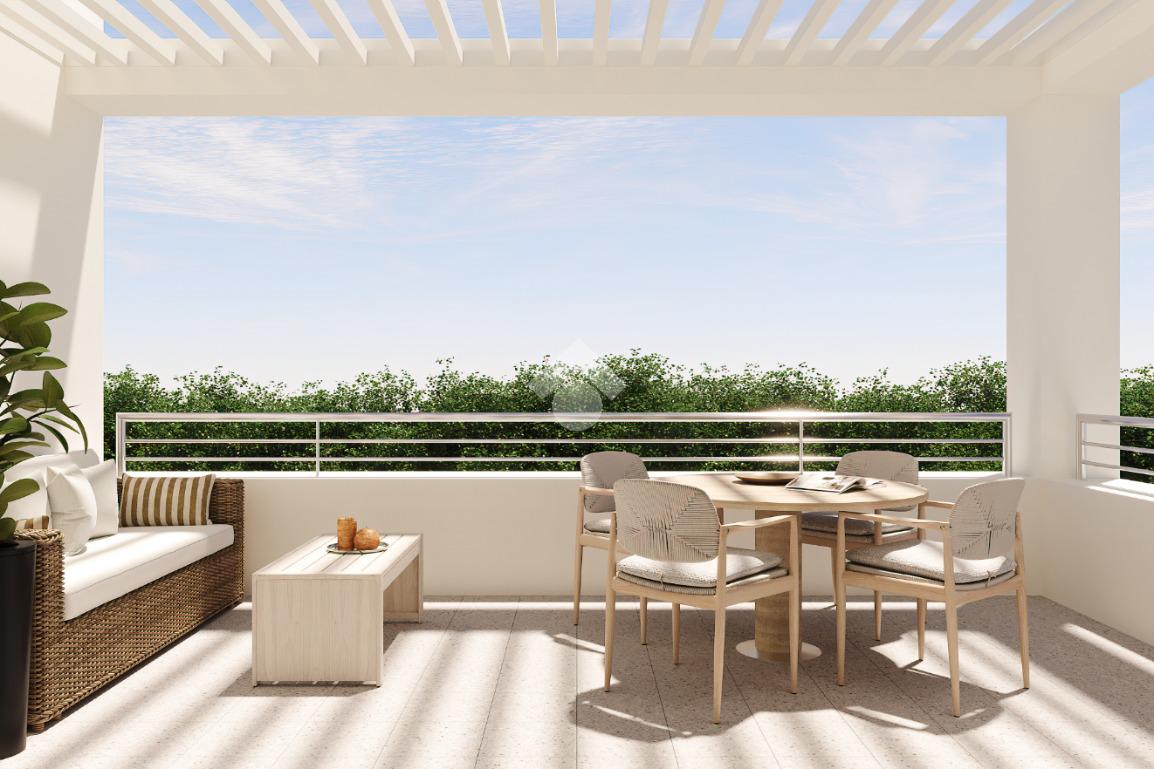 Piano secondo attico. Ingresso, soggiorno di oltre 30 mq, cucina abitabile separata di 10mq. Due camere da letto matrimoniali, bagno e ripostiglio. Terrazza di 15mq. Esposizione est-sud-ovest. Esclusa autorimessa da abbinare.